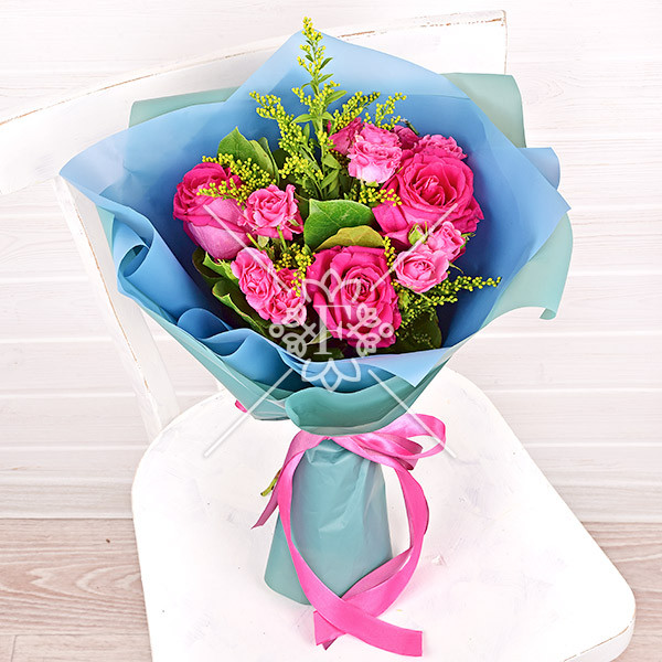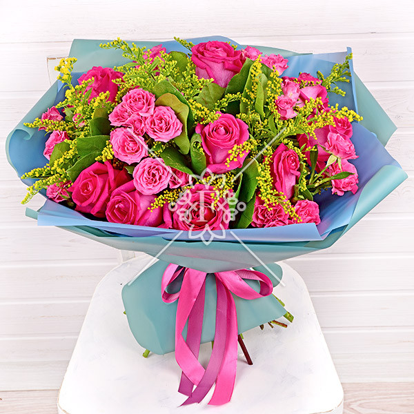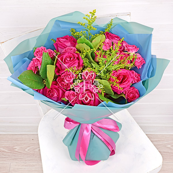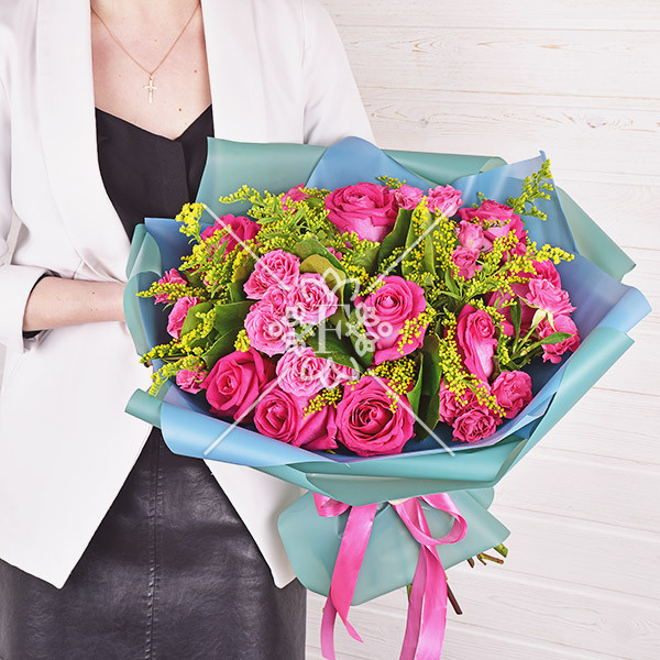 роза малиновая – 3 шт., роза малиновая кустовая –2 шт., зелень декоративная (солидаго, салал), упаковка, лента.